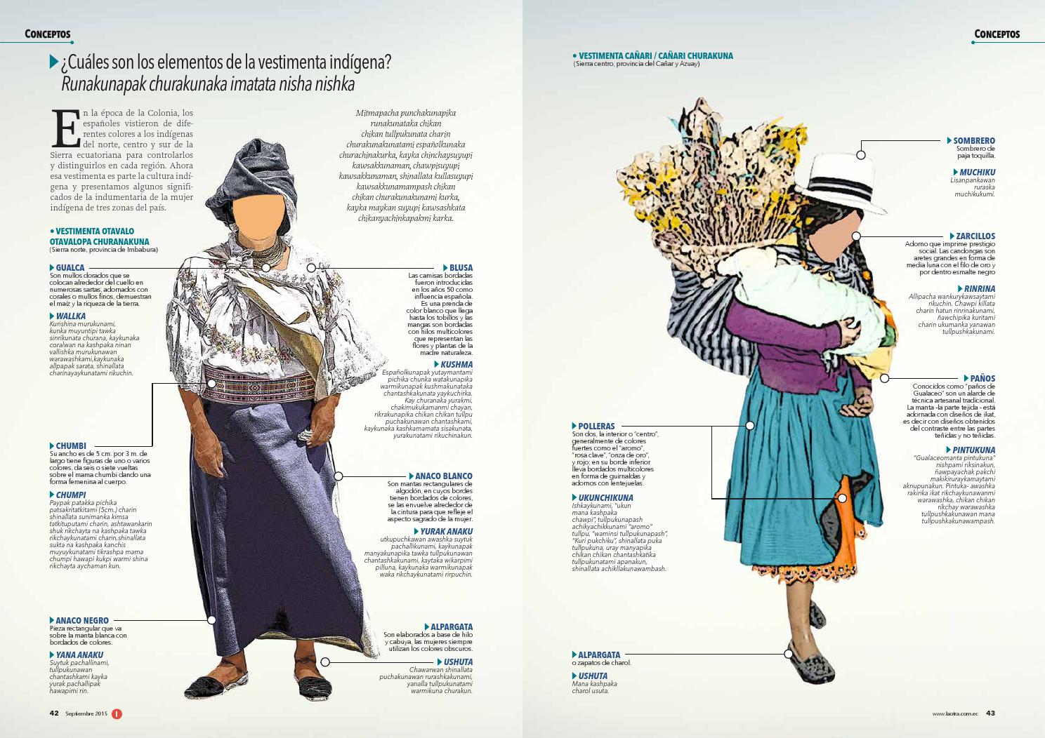 La vestimenta tanto del hombre como el de la mujer guardan una estrecha relación con la cosmovisión y con el sistema de documentación de sus conocimientos a través de la combinación de los colores (espectro visible de la luz) y sus bordados con la geometría fractal; sistema que fue esencial para el almacenamiento de la información de los pueblos originarios de los andes, antes de la incorporación de nuevo formato de documentación con base en el alfabeto latino (abecedario).